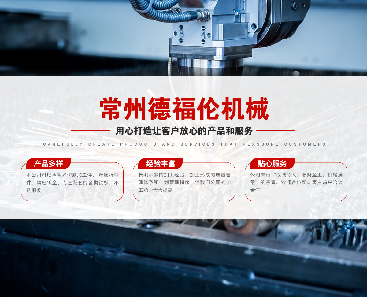 常州德福倫機械有限公司成立于2014年12月19號,位于江蘇省常州市武進區(qū)遙觀鎮(zhèn)建農村劍童路56號西門;公司配備;1萬瓦通K激光切割機1臺,6千瓦領C激光切割機1臺;機器行程6米*2.2米,切割不銹鋼50mm,碳鋼30mm;300噸大型數控折彎機。精密焊接機器數臺。本公司可以承激光切割加工件、,精密折彎件、精密鈑金、專營配套的各類鐵板,不銹鋼板。長期積累的加工經驗,加上形成的質量管理體系和計劃管理程序,使我們公司的加工能力大大提高,滿足客戶所需,是我們公司的目標!公司奉行“以誠待人,服務為上,價格滿意”的宗旨。歡迎各位領導;老總前來洽談合作!